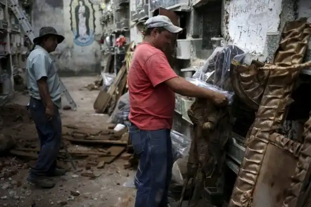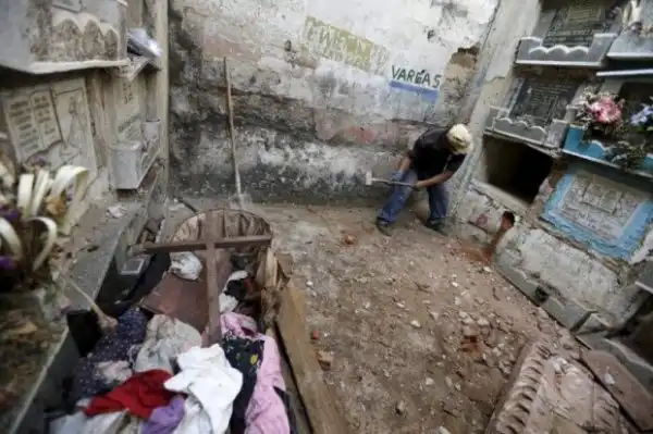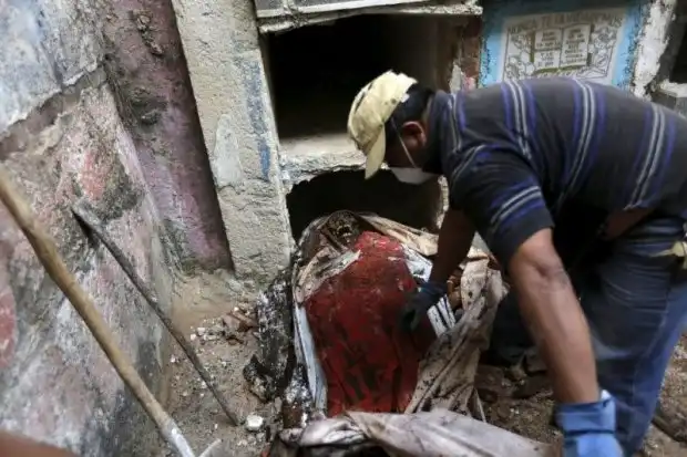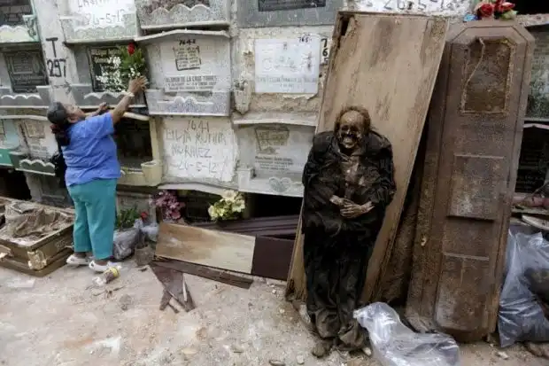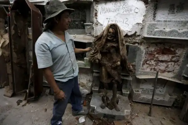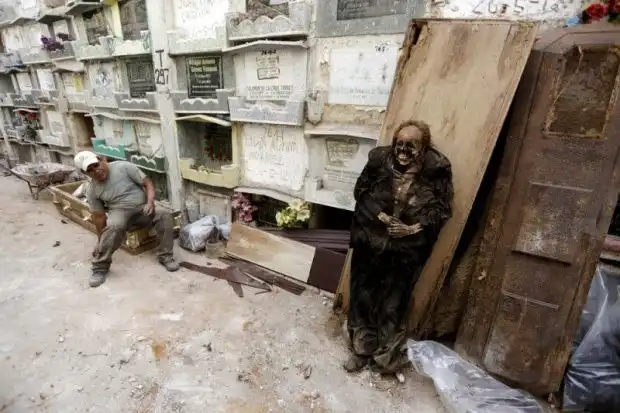 На общественном кладбище Гватемалы, когда заканчивается срок аренды могилы, а родственники не могут или не хотят его продлевать, могилы вскрывают, останки запаковывают в пластиковые пакеты и захоранивают в общие могилы. Так как погода в Гватемале теплая и сухая, тела не разлагаются, а превращаются в мумию. Эти жутковатые кадры сделаны 15 апреля 2015 года.
