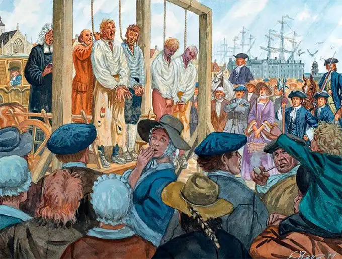Большинство пиратов «золотого века» кончили очень плохо. Лишь единицам из них удалось потихоньку выйти из дела или попасть под амнистию и начать новую жизнь. Подавляющее большинство же пиратов или погибло в бою, или оказалось на виселице. Если суд над пиратом шел в Англии, то осужденных доставляли в лондонскую тюрьму Икзекьюшн-Док в Уоппинге на берегу Темзы. Здесь у линии отлива сооружалась деревянная виселица. После короткой молитвы, читаемой капелланом, пирату предоставлялось право сказать последнее слово, после чего происходила казнь. После того, как повешенного трижды заливал прилив, тело снимали и хоронили в безымянной могиле.