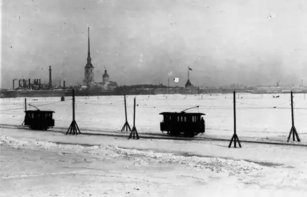 Зимой 1894 года на льду Невы появились первые пассажирские вагоны. Они ходили по четырём маршрутам. Сначала это было своеобразным аттракционом: вагоны под действием силы тяжести двигались по наклонно уложенным рельсам с Васильевского острова на Сенатскую площадь и обратно. Но уже через год на смену миниатюрным открытым вагонам пришёл настоящий трамвай на электрической тяге, который горожане сразу назвали «ледовый трамвай».