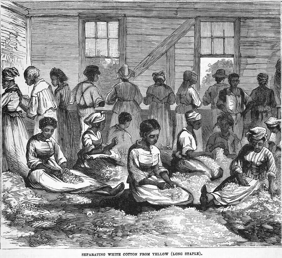 Рабы занимаются очисткой хлопка (Юг США, 1869 год)