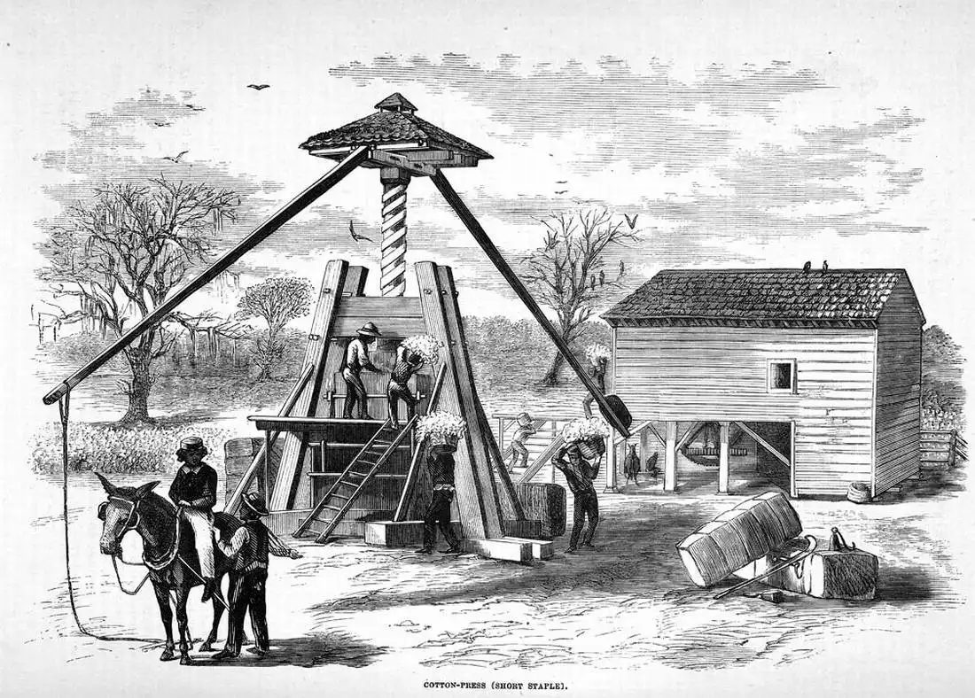 Рабы занимаются прессованием тюков хлопка (штат Южная Каролина, 1880 год)