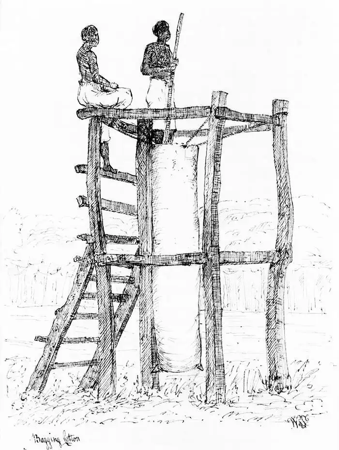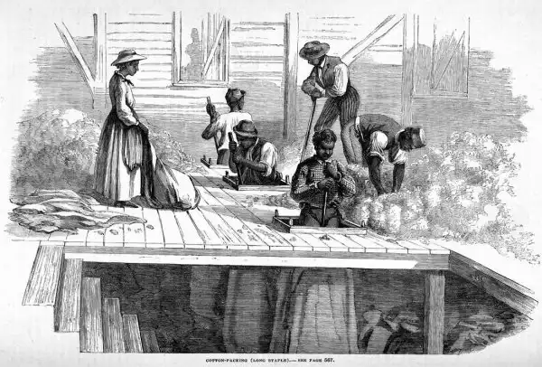 Рабы занимаются упаковкой хлопка в мешки (штат Южная Каролина, 1880 год)