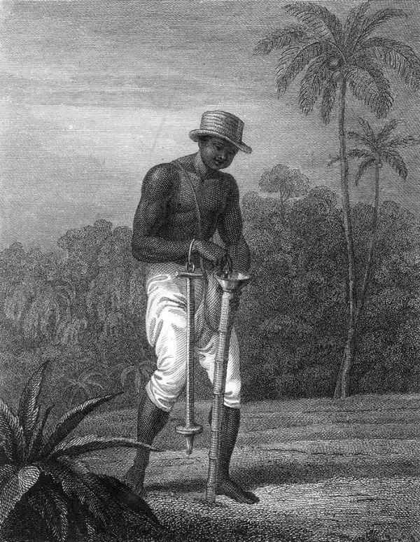 Раб занимается посадкой семян хлопка (Суринам, 1807 год)