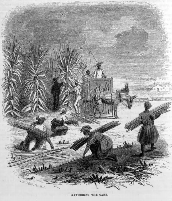 Рабы занимаются сбором урожая сахарного тростника (штат Луизиана, 1853 год)