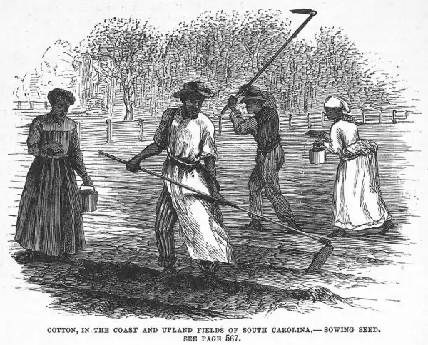 Рабы на посадке семян хлопчатника (штат Южная Каролина, 1880 год)