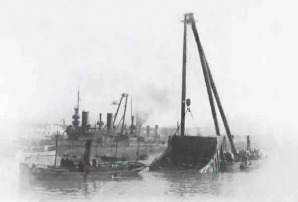 Буксировка одного из кессонов «Цесаревича», Восточный бассейн Порт-Артура, февраль 1904 г.