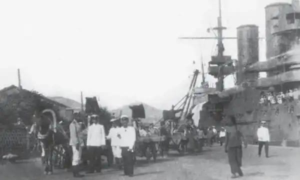 Пулемёты Максима с «Цесаревича» свозят на береговые укрепления, май 1905 г.