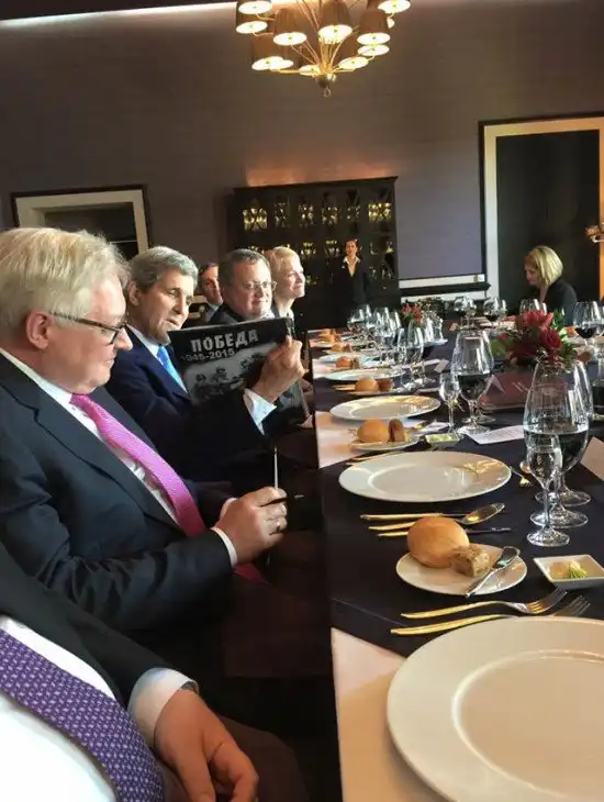 Сергей Лавров подарил Джону Керри футболку с 70-летием победы и две небольшие корзинки с картофелем и помидорами, выращенными в Краснодарском крае. Этот картофель является дальним родственником тех двух картошек, которые 2 года назад глава Госдепа подарил Сергею Лаврову, правда, они так и не принялись в российской почве.