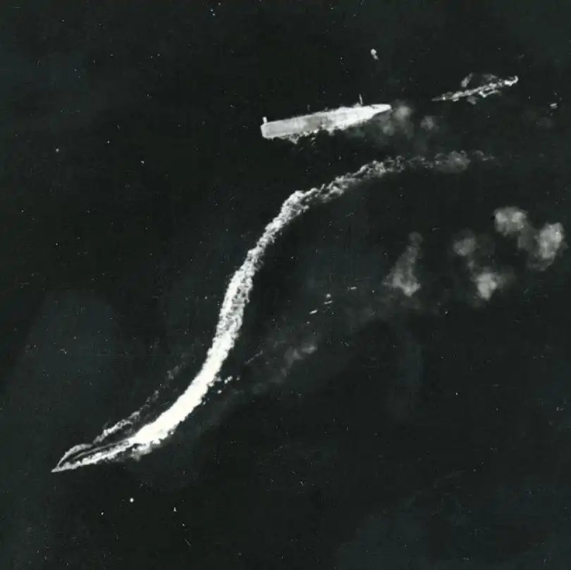 Обездвиженный «Рюдзё» (справа от центра) после атаки 24 августа 1942 года, фотография с высотных