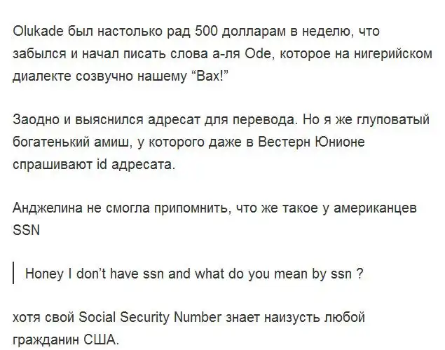 Далее вас ждет история о том, как один парень имел дело с нигерийскими мошенниками. Стоит отметить, что история довольно запутанная, однако, нашему герою удалось не поддаться на уловки злоумышленников, более того он даже сам сумел обмануть их на 600 долларов.