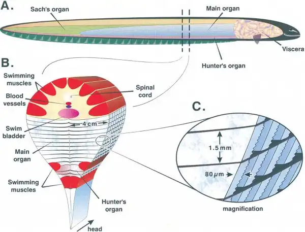 Все его тело покрывают специальные органы, которые состоят из особых клеток. Эти клетки последовательно соединены между собой при помощи нервных каналов. В передней части тела «плюс», в задней «минус». Слабое электричество образуется в самом начале и, проходя последовательно от органа к органу, оно набирает силу, чтобы ударить как можно более эффективно.