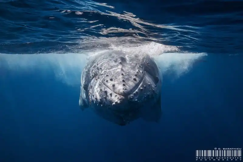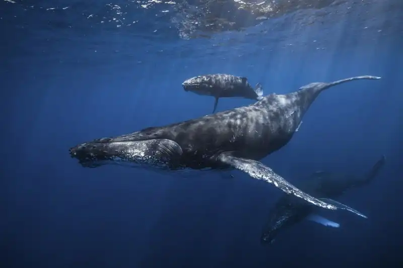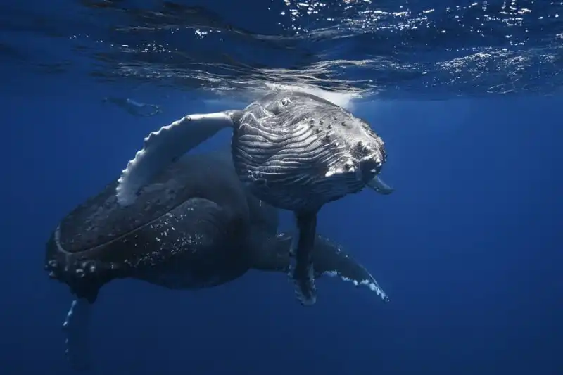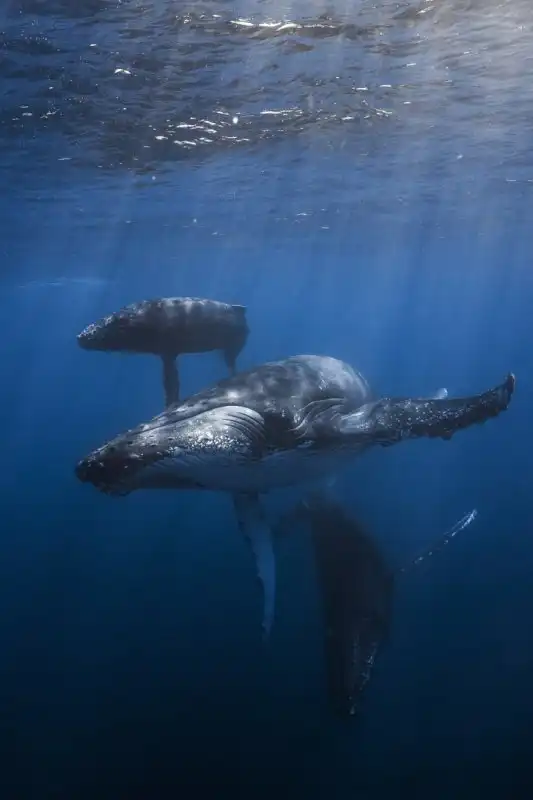 Он запечатлел китов в кристально чистых океанских водах.