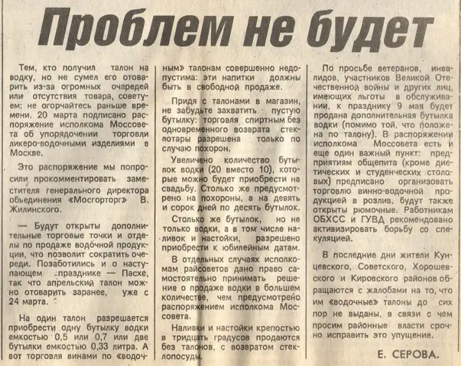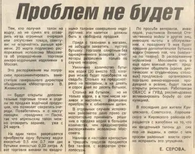 Глупейший закон, который подписал Горбачёв. Поддержали его члены Политбюро ЦК КПСС Егор Лигачёв и Михаил Соломенцев. Алкоголь стали продавать в магазинах только с 14.00 до 19.00. Народ стал гнать самогон и пить суррогаты, одеколон, стеклоочистители. Помните у «Нау»: «Ален Делон, Ален Делон не пьёт одеколон». Во-во… Резко увеличилась смертность из-за этого запрета.