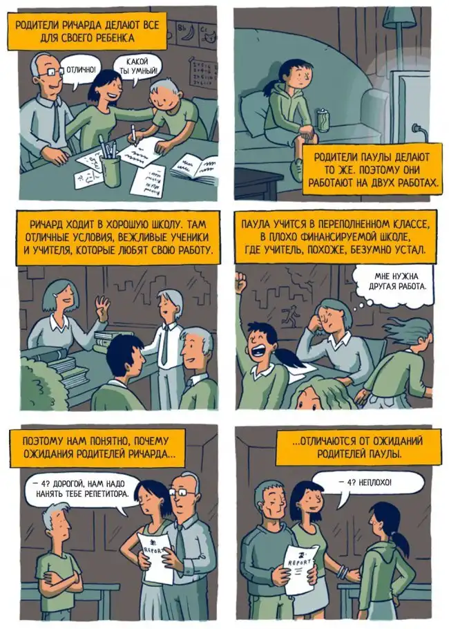Вы тогда к левому семейству, пририсуйте картинку, где быть хуже других - плохо и это вдалбливается годами, необратимо влияя на психику ( не вплане что человек становиться психом, а в конечных подходах к одному и тому же делу ), у меня много знакомых с обоих картинок, и как то два друга из разных сословий чинили пол, так тот что был справа положил сверху картонку и накрыл ковром и был доволен, а вот тот что слева, которого учили все делать до конца, вырвал сломаную плаху, сходил магазин выточил по размерам и починил пол. У этих людей часто ОЧЕНЬ разный подход к труду. пример есть и в картинках справа не довольны 4, они знают и верят в то что он может учиться на отлично, поэтому задирают ему жизненную планку, а слева и 4 рады, тем самым с детства не настраивая ребенка на самокритику и желание становится лучше, мол и так сойдет.