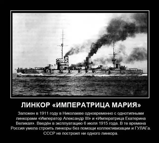ГУЛАГ и линкоры – это сильно. Впрочем, автор плаката кое в чем прав: Советский Союз действительно не спустил на воду и не ввел в строй ни одного линкора (несмотря на то, что дважды принимался за их строительство).