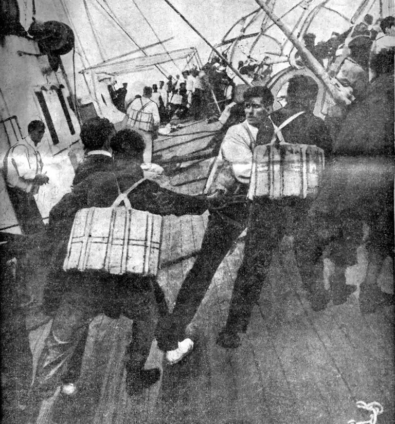 А за эти 10 часов на борту творился кошмар. В дневнике одного из спасшихся есть такая запись: “В 6 часов утра в понедельник море неожиданно стихло, и мне показалось, что судно снова выпрямилось. Но к 10 часам крен опять увеличился, потом капитан приказал спустить на воду шлюпки. Я был в шлюпке N8, когда её спускали на воду, она ударилась о борт , и почти всд из неё вывалились в воду”. Трое матросов бросились в воду и смогли спасти нескольких человек, но остальные утонули на глазах испуганных людей. Спуск следующей шлюпки с женщинами и детьми завершился ещё более трагично: в последний момент, когда шлюпка уже стояла на ровном киле, на неё упала стальная шлюпбалка весом в полторы тонны… Почти все её пассажиры были раздавлены и утонули. Удачно удалось спустить 5 шлюпок с наветренного борта, но на лайнере оставались примерно 100 человек, а помощь была ещё далеко. К трём часам дня окончательно лёг на борт, и люди, боясь, что их затянет на дно вместе с пароходом, стали просто прыгать в воду. Последний покинул лайнер старший стюард Альфред Дункан, он же был последним, кто видел капитана в живых… По словам Дункана, тот даже не стал надевать нагрудник. К 3 часам ночи появился первый спасатель – пароход и начал по мере возможности подбирать оставшихся в живых. Чуть позже подошёл лайнер . Казалось, что самое страшное позади, но тут появилась новая напасть – акулы. Японскому атташе в Бразилии майору Иноюй и океанская охотница откусила руку, и он умер уже на борту . Когда подсчитали число спасённых, выяснилось, что – пароход, построенный по высшему классу регистра Ллойда, из-за незначительного шторма унёс на дно 159 человеческих жизней. Комиссия по расследованию пришла к выводам: во первых, капитан судна, следуя постановлению своей фирмы, слишком долго не обращался за помощью, рассчитывая справиться своими силами. Если бы сигнал SOS был послан несколько часов раньше, многих жертв можно было бы избежать. Во вторых, были выявлены проблемы в санитарной системе парохода: как выяснилось, именно через фекальные стоки и поступала забортная вода, а поскольку система располагалась под загруженными углём бункерами, никто не мог определить, откуда идёт течь. Ну и самый главный вывод – судно было против всяких правил перегружено. Именно нелепая гибель наглядно продемонстрировала необходимость вспомнить старый морской закон: