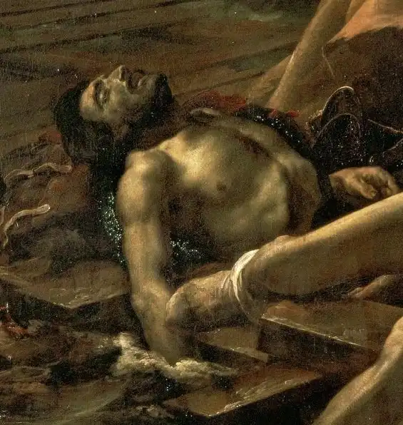 В 1819 году двухлетний труд завершен. Но перед тем, как отправить картину на выставку, художник еще и еще раз всматривается в огромное полотно. Справа видна дыра в плоту. За одну ночь появляется изображение полуобнаженного человека, погруженного в воду.