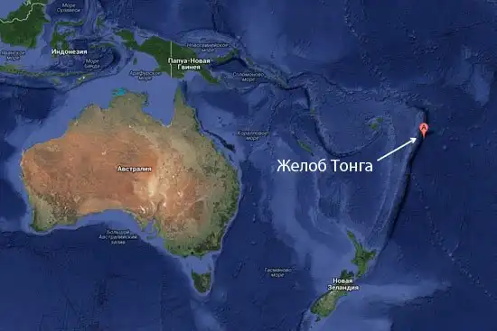 Жёлоб Тонга — самая глубока впадина в Южном полушарии и вторая по глубине на Земле. Максимальная известная глубина — 10 882 м. Он необычен прежде всего тем, что скорость движения литосферных плит в районе Тонга намного больше, чем во всех остальных частях планеты, где есть разрывы в земной коре. Здесь плиты двигаются со скоростью 25,4 см в год против обычных 2 см. Это удалось установить, наблюдая за крошечным островком Ниаутопутану, который ежегодно сдвигается в среднем как раз на 25 см.