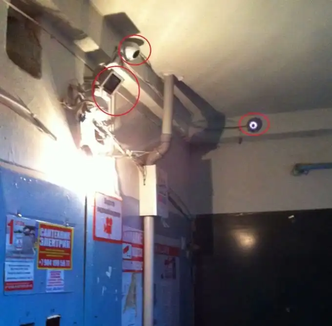 Сразу у входа установлены три камеры, провода от которых тянутся вверх по стене.
