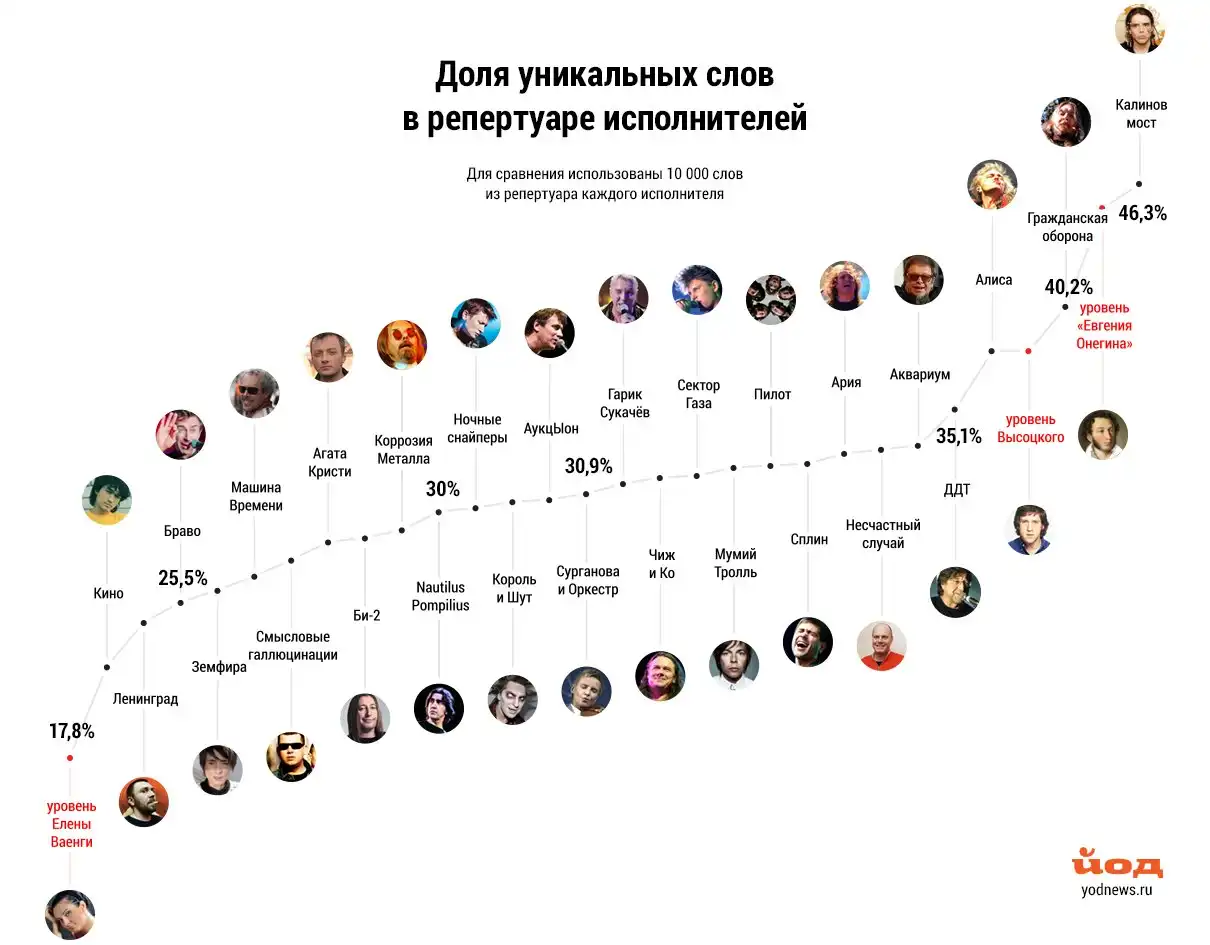 Во многих песнях можно встретить часто повторяющиеся слова, причем в репертуаре некоторых исполнителей такие слова можно услышать особенно часто. Предлагаем вам сравнить уникальность слов в песнях отечественных исполнителей.