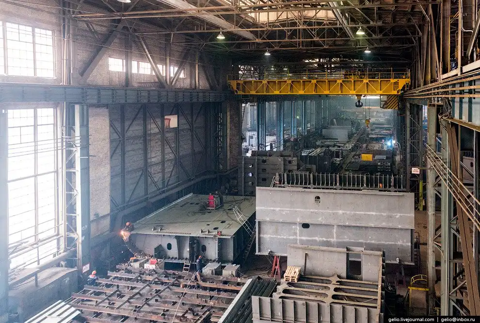 Цех разделен на 4 пролета. В нулевом пролете расположены участок изготовления объемных секций. Участок оснащен двумя мостовыми кранами грузоподъемностью 50 и 80 тонн.