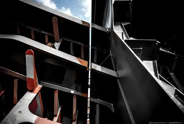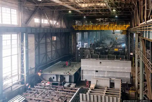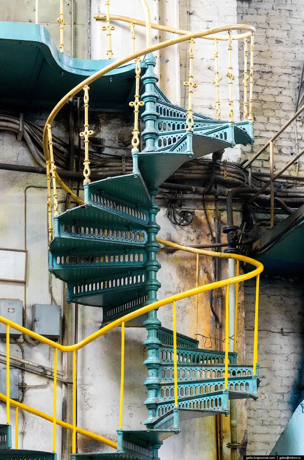 А еще этот цех примечателен тем, что в нем установлена красивая винтовая лестница-трап, ведущая в обычную кабину крановщика. Говорят, что этот трап снят с крейсера «Рюрик» (1906 года постройки) во время распила в 1925 году.
