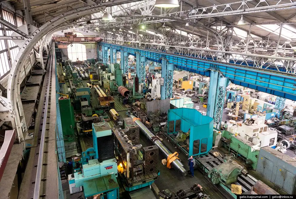 Цех по изготовлению гребных валов. Они могут быть длиною до 33 метров и массой до 70 тонн. Большой вал на переднем плане — для атомного ледокола «Арктика».