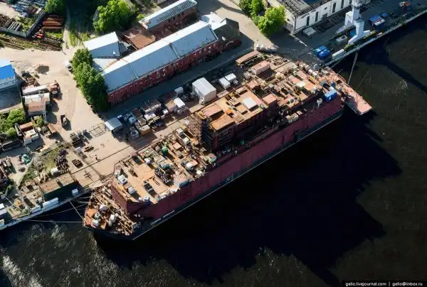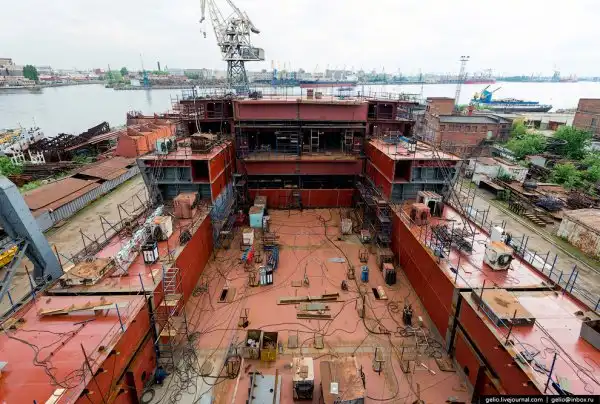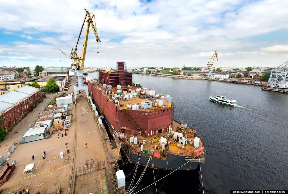 Достроечная набережная Балтийского завода. Сейчас здесь производится достройка плавучего энергоблока (ПЭБ) «Академик Ломоносов». ПЭБ войдет в состав первой в мире плавучей атомной электростанции малой мощности, состоящей из гладкопалубного несамоходного судна с двумя реакторными установками.