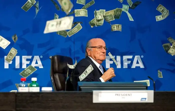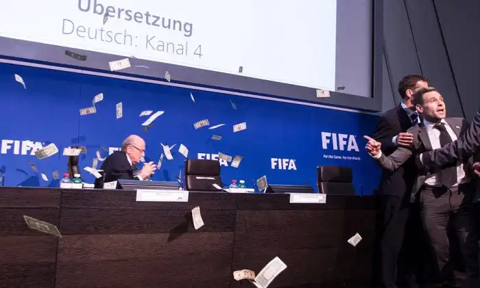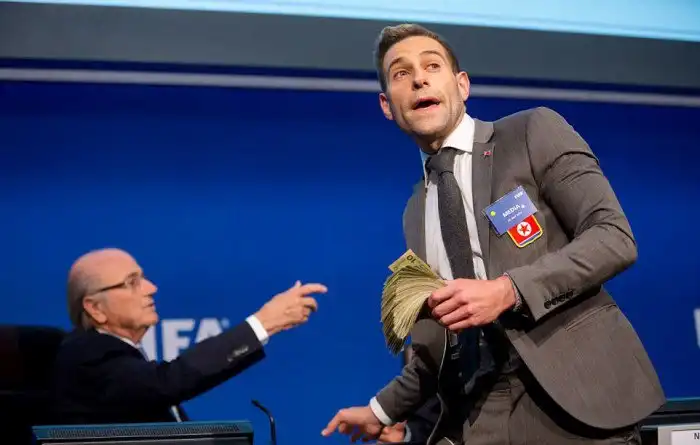 Комик Саймон Бродкин (Ли Нельсон) бросил пачку денег в главу ФИФА Йозефа Блаттера