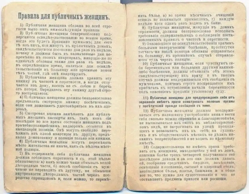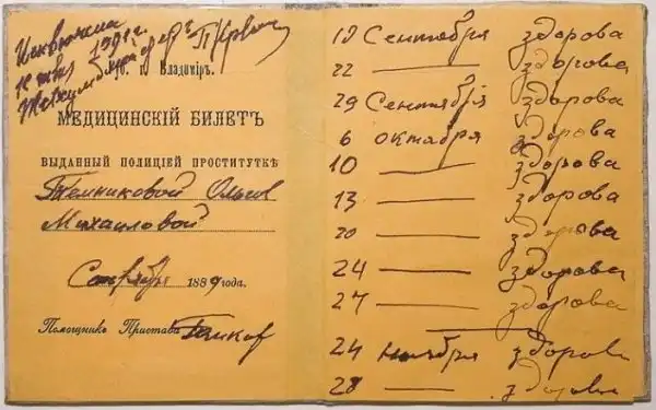 До революции проституток ставили на учет, обязывали проходить медицинский контроль не реже двух раз в месяц. Женщинам выдавали так называемый желтый билет, который иначе назывался заменительным, поскольку выдавался взамен паспорта.