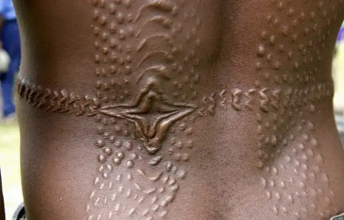 Племена, живущие вдоль реки Сепик в Папуа — Новой Гвинее, использовали традицию скарификации при посвящении мальчиков в мужчины в течение многих десятилетий. При этой церемонии молодым людям срезали кусочки кожи вдоль их спин, груди и ягодиц. С помощью подобных шрамов делали сложные узоры, чтобы имитировать грубую кожу крокодила. Местные племена считали крокодилов священными животными. Ритуал мог занимать несколько недель.