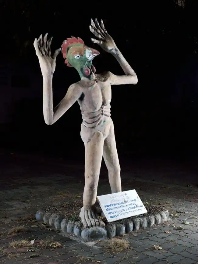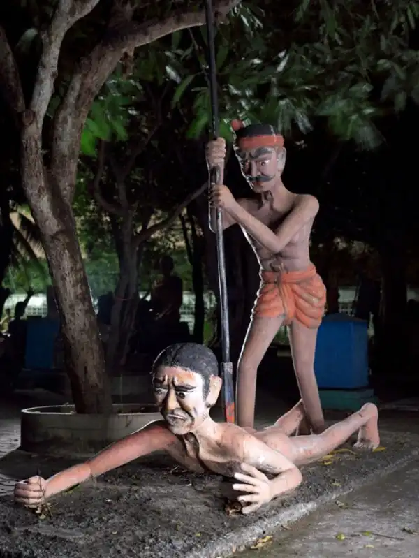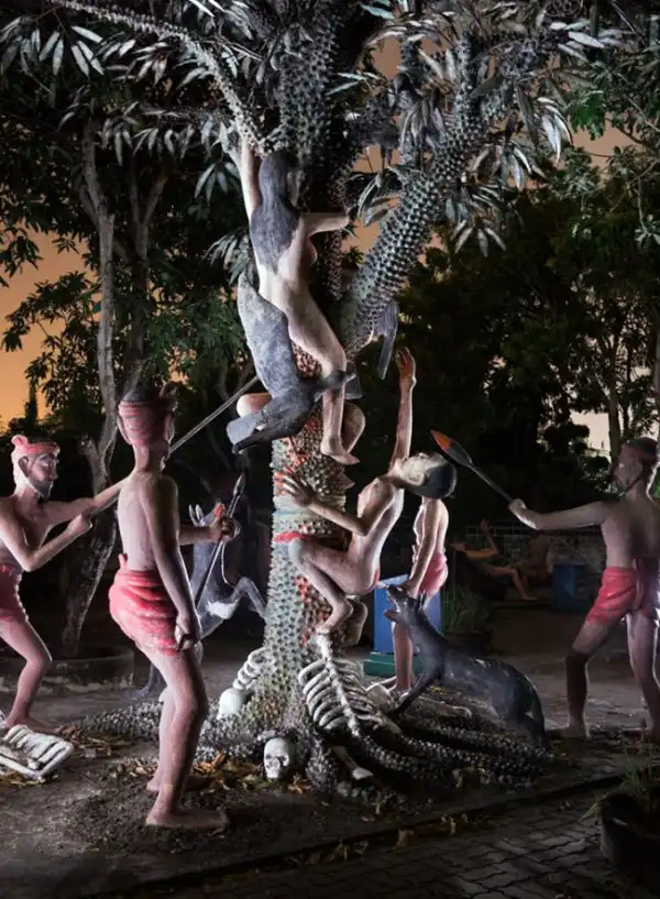 Мужчина и женщина на дереве несут наказание за супружескую измену. Шипы, листья и ветки этого дерева сделаны и раскрашены мастерами вручную.