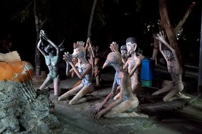 В дневное время сад открыт для посетителей. Сотни тайцев приводят с собой детей, чтобы продемонстрировать им тяжкие муки грешников и привить уважительное отношение к своей религии.