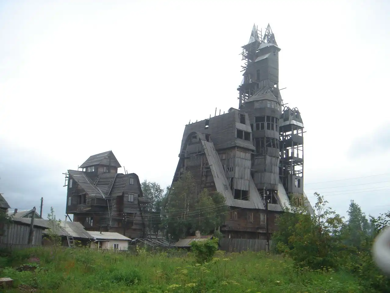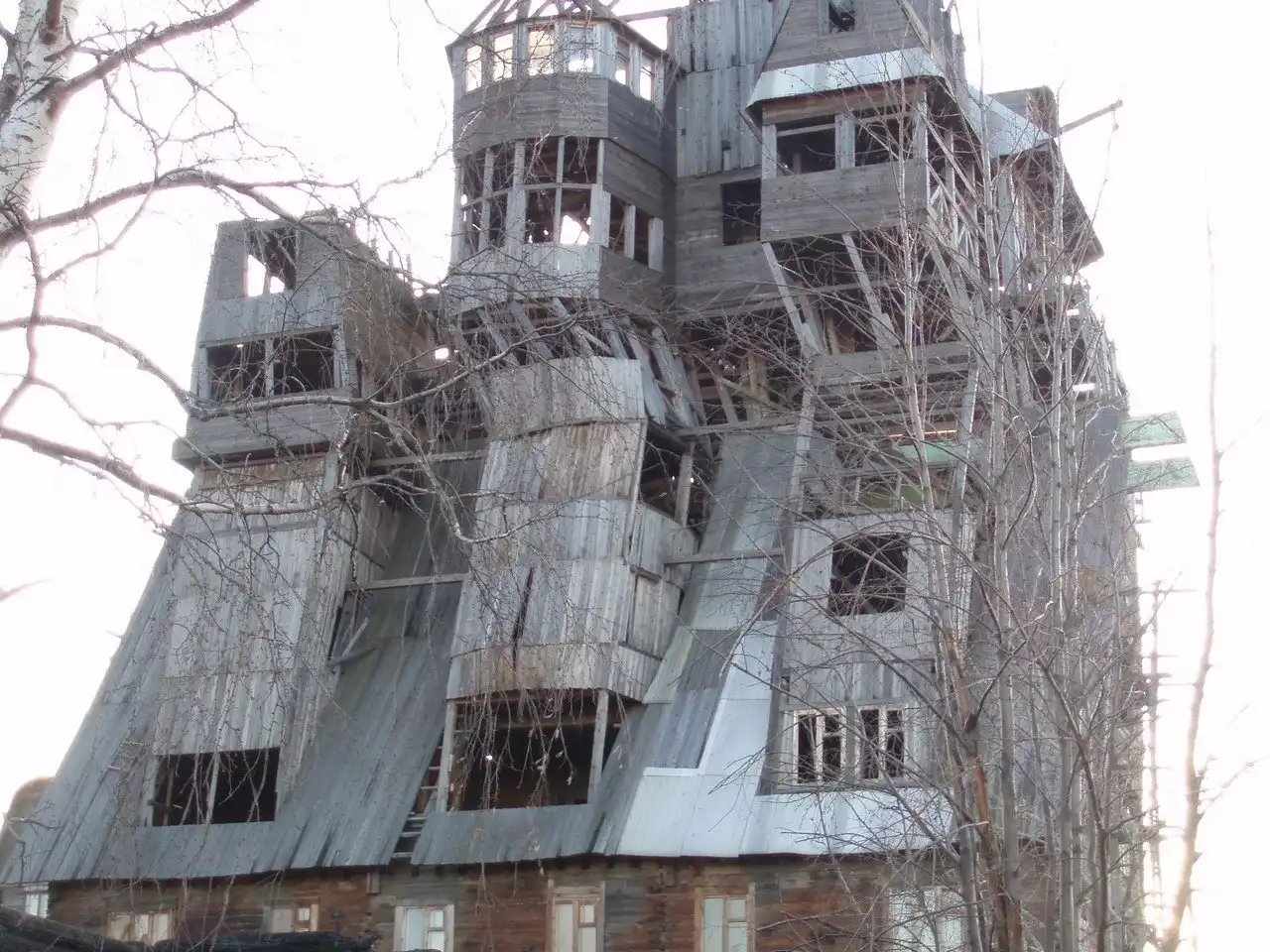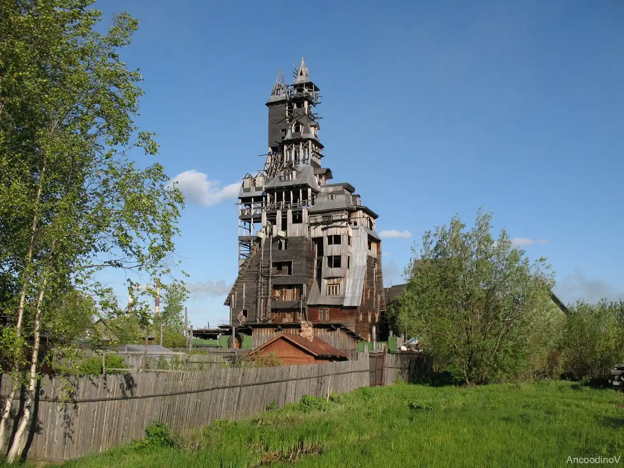 Несколько лет назад, в северной части России, на окраине города Архангельска, стоял высокий деревянный дом – причудливый винегрет из опалубки, который вырос во всех направлениях, но в основном вверх. Издали он напоминал японскую пагоду, но при близком рассмотрении это была фантасмагорическая конструкция, которая больше походила на логово злого сказочного персонажа. Он имел 13 этажей и достигал высоты 44 метров.