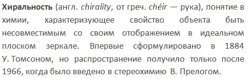 Термин хиральность в последующем введен лордом Кельвином (Уильям Томсон), представившим изомеры молекул рацемата, как две руки, которые нельзя наложить друг на друга. Именно хиральность лежит в основе клеточного синтеза высокоспецифичных ферментативных систем и иммунных реакций, то есть всех важнейших процессов в живом организме.