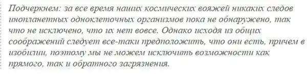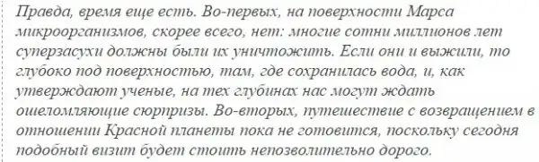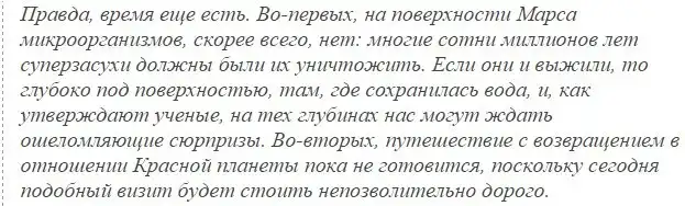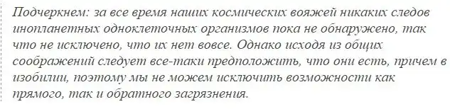 Ее авторы полагают, что меры по стерилизации потребуются только в тех случаях, когда автоматические зонды будут исследовать ту среду, где марсианская жизнь может существовать сейчас — и то, только затем, чтобы не перепутать микроорганизмы-аборигены и привезенные с собой.