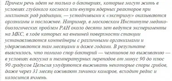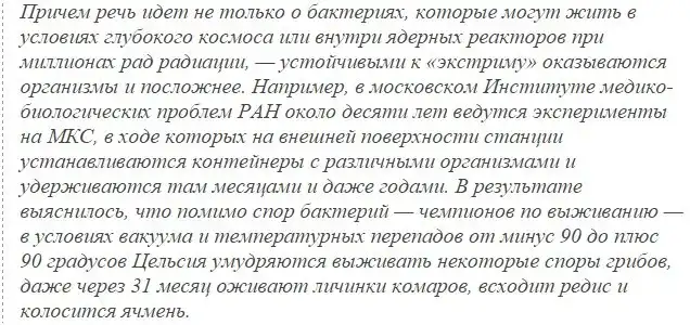 В первую очередь людей волнует обратное загрязнение: важно понять, как избежать смертельно опасного вторжения извне. Поскольку инопланетных микроорганизмов до сих пор не найдено, ученые работают с земными малютками — экстремофилами, которые способны жить и размножаться в экстремальных условиях — при очень высоких температурах, при космическом холоде, при чрезмерных давлениях, высокой радиации. Неизвестно, способны ли существующие у нас экстремофилы уничтожить биоту целой планеты, к их атаке не подготовленную, но то, что эти теоретические убийцы обязаны быть экстремофилами, сомнению не подлежит. И таких экстремофилов, оказывается, вполне хватает и на Земле.