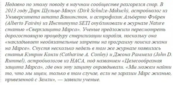 Однако астробиологи Альберто Фэйрен (Alberto Fairen) из Корнеллского университета и Дирк Шульце-Макуч (Dirk Schulze-Makuch) считают, что эти предосторожности не имеют смысла уже несколько миллиардов лет.