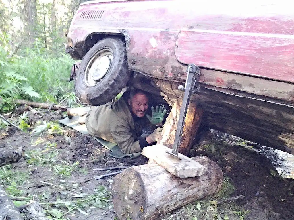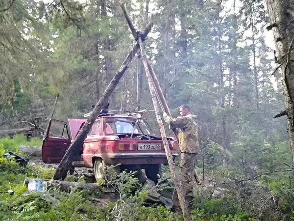 Приходилось набирать высокие обороты двигателя, потом отпускать сцепление и, тронувшись, просто давить педаль газа что есть силы. Но быстро ехать из-за корней, торчащих бревен и камней там невозможно, поэтому приходилось постоянно отпускать педаль газа, машина сразу переставала тянуть и вставала. От таких скоростных прыжков по камням оторвали глушитель. Лес очень быстро наполнился запахом горелого сцепления и ревом, а ближе к концу подъема сцепление начало все сильней и сильней пробуксовывать, пока совсем не перестало подавать признаков жизни. И вот мы уже присматриваем хоть какую-то площадку на крутом склоне для замены сцепления. А для этого нужно полностью снять с машины двигатель вместе с коробкой, которые в сборе весят почти 200 килограмм. Решили изготовить треногу из бревен и через блок вытаскивать двигатель руками.