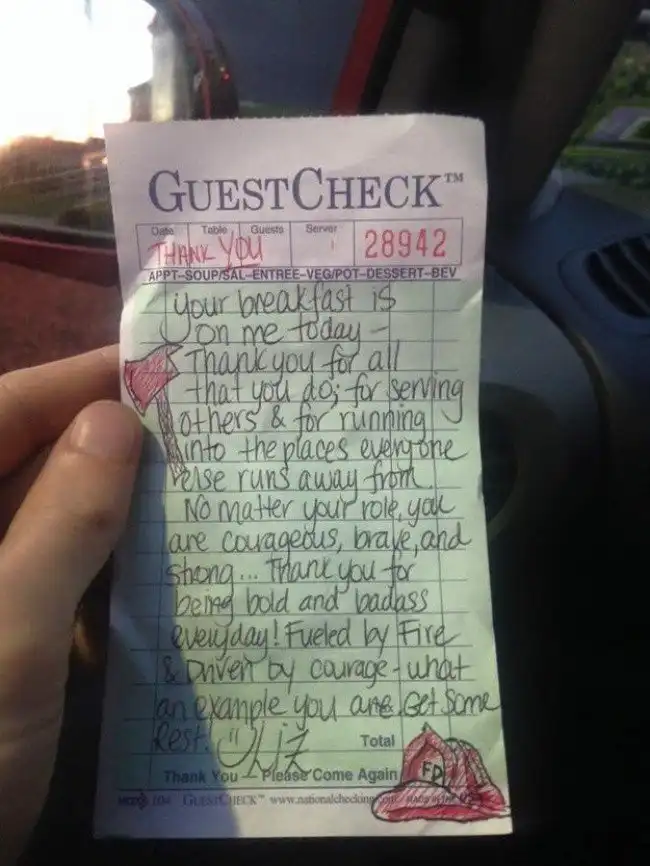 Подкрепившись, пожарные попросили у официантки счет. Но Лиз, заметив, насколько сильно они вымотаны, сама оплатила их счет, и оставила им записку: