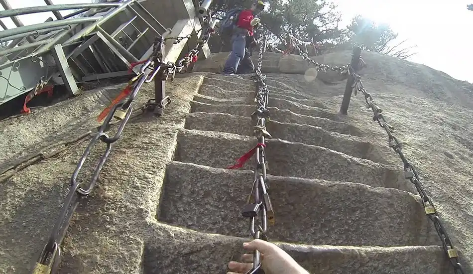 Точного количества ступеней, вырезанных прямо на поверхности горы Хуашань, одной из пяти священных гор даосизма в Китае, никто не знает. Вероятно, потому что каждый, кто когда-либо пытался вести счет, сбивался с него из-за головокружительных условий и страха смерти. После того, как вертикальное восхождение закончится, вас ждет не менее адская горизонтальная прогулка — дорожка шириной всего в три доски, прибитых прямо к вертикальному склону горы и лишь одна цепь, за которую можно держаться. После этого — снова череда извилистых ступеней. Когда вы наконец дойдете до вершины Хуашань, вы узнаете, что «небеса»— это труднодоступный чайный домик с потрясающим видом.