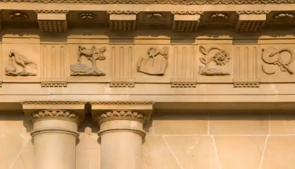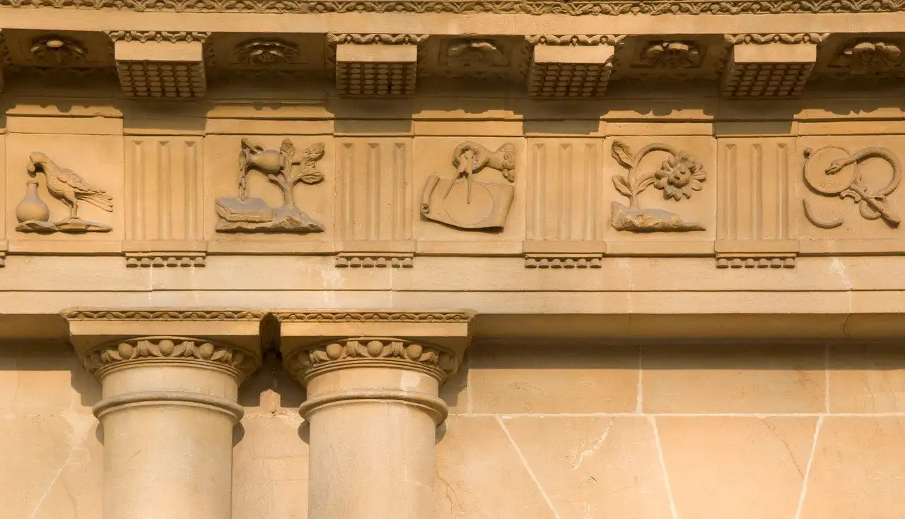 Здание состоит из трех сегментов равной длины образуя круг и с воздуха напоминает очертания ключа. Три этажа со связанными столбцами, тяжелые резные карнизы, скульптурные украшения и множество масонских символов, архитектурная схема здания поистине богата и не может не впечатлять. Здание было повреждено и восстановлено в 1942 году и до сих пор сохраняет первозданное великолепие, привлекая туристов и гостей города.