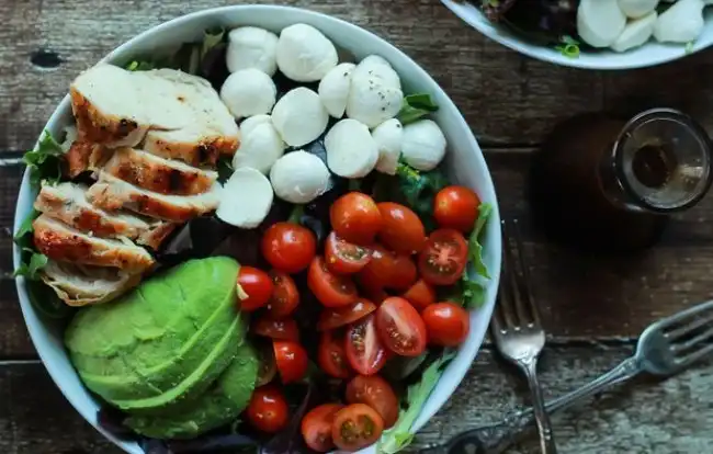 Затем нарезать пополам помидоры черри, моцареллу, авокадо.
