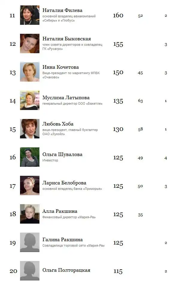 Forbes Woman составил рейтинг 50-ти самых богатых женщин России. В 2015 году в рейтинге оказались, как сторожилы, так и новички. Среди них частные предприниматели и жены крупных чиновников.