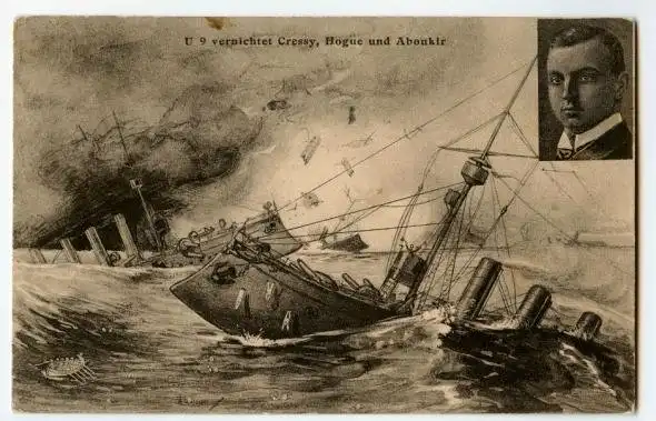 Вообще то, в этом бою было много случайностей и совпадений. Скажем, что на U 9 во время этого же шторма из строя вышел компас, и лодка чуть не села на мель. Но случилось то, что случилось и 22 сентября 1914года около шести часов утра ,три британских крейсера шли кильватерной колонной со скоростью 8 узлов, ну как на параде. Первым дымы на горизонте заметил старпом. Командиром была отдана команда на срочное погружение, с дифферентом на нос. Лодка погрузилась на перископную глубину и вскоре обнаружила три британских крейсера, идущих с интервалом в 2 мили. Изначально Веддиген принял их за более лёгкие крейсера типа "Бирмингем", но потом цель была уверенно опознана, как броненосные крейсера типа "Кресси".Первая в этот день торпеда была выпущена с дистанции около 3х кабельтовых(примерно 550 метров). Через пол минуты торпеда попала в цель. У правого борта "Абукира" произошёл сильнейший взрыв, и он получил сильный крен. Подводной лодки британцы не заметили, и капитан предположил, что "Абукир" натолкнулся на мину. Так как в то время по британскому флоту ещё не был отдан приказ, о не оказании помощи тонущим кораблям при наличии подводной угрозы, то капитан "Хога" подошёл к повреждённому кораблю и спустил шлюпки. Перед носом у Веддигена оказывается второй крейсер, на дистанции около 2х кабельтовых ( 350 метров), и он выпускает ещё две торпеды. "Хог" получает смертельные повреждения и начинает тонуть. В этот момент из -за несовершенного управления балластом, на лодке не смогли компенсировать массу выпущенных торпед, и лодку выбросило на поверхность. Представьте, скорлупка которую мог утопить ЛЮБОЙ снаряд из любой пушки британских кораблей, всплывает на расстоянии менее 500метров от них. Заставить лодку погрузиться сразу не вышло, и "Хог" успел отстреляться по ней бортовым залпом. Но или Бог хранил немцев, или подготовка комендоров у англичан была ниже всякой критики, однако лодка повреждений не получила и смогла погрузиться. В течении следующих пятнадцати минут оба британских корабля отправились на дно. Тому, что произошло потом, логического объяснения нет. "Кресси" полным ходом подошёл к месту побоища, сбросил ход и открыл огонь по перископу U 9. По неизвестным причинам англичане решили что попали , но немцы сильно разочаровали их в ответ, выпустив из кормовых торпедных аппаратов две торпеды. Одна из них попала в цель. Повреждённый "Кресси" с непонятным упорством отказывается уходить с места боя, и продолжает безрезультатно стрелять по немецкой лодке. Скорее всего, англичане планировали спасатаельную операцию. Обычно этим занимаются приданные большим кораблям миноносцы, но сильный шторм накануне загнал их в гавань. В результате Веддиген перезаряжает носовой торпедный аппарат( а в те времена это целая процедура), на небольшой глубине обходит англичан, и топит их последней торпедой.