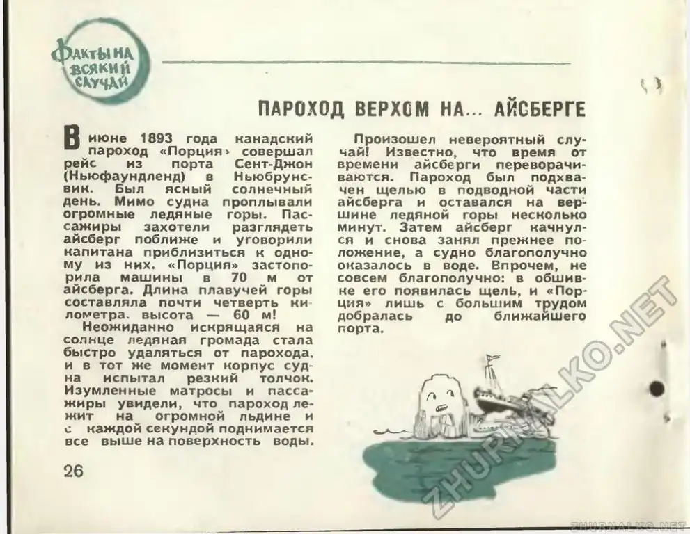 В июне далёкого 1893–го года пароход «Порция» («Portia», на фото) шел из Нью–Йорка в сторону Ньюфаундленда, имея на борту груз туристов. Ни состояние моря, ни поведение груза не предвещало беды, но вскоре на горизонте замаячил айсберг. Большой (около 250 метров в ширину, 60 — в высоту) и очень красивый.