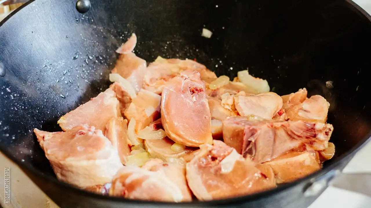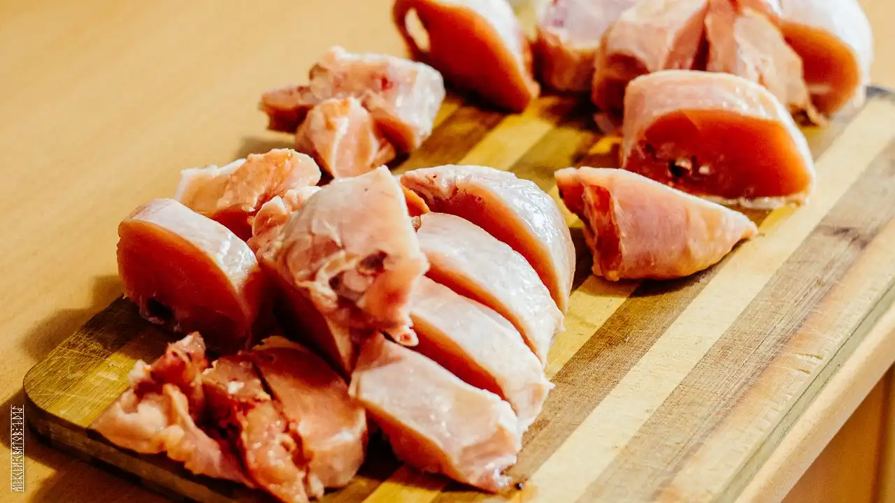 Главное нам быстро всё сделать, поэтому режем всё крупными кусками с яйцо примерно, картошину. Это куринная грудка, недолго жариться да тушиться будет.