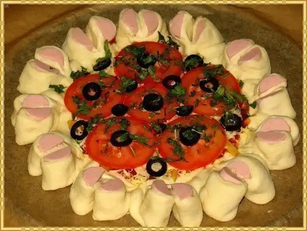Раскатать тоненько дрожжевое тесто на присыпанном мукой столе. Переложить на противень для выпекания. На тесто уложить кружочком кусочки сосисок, сначала порезав вдоль, затем поперёк на 3 части.