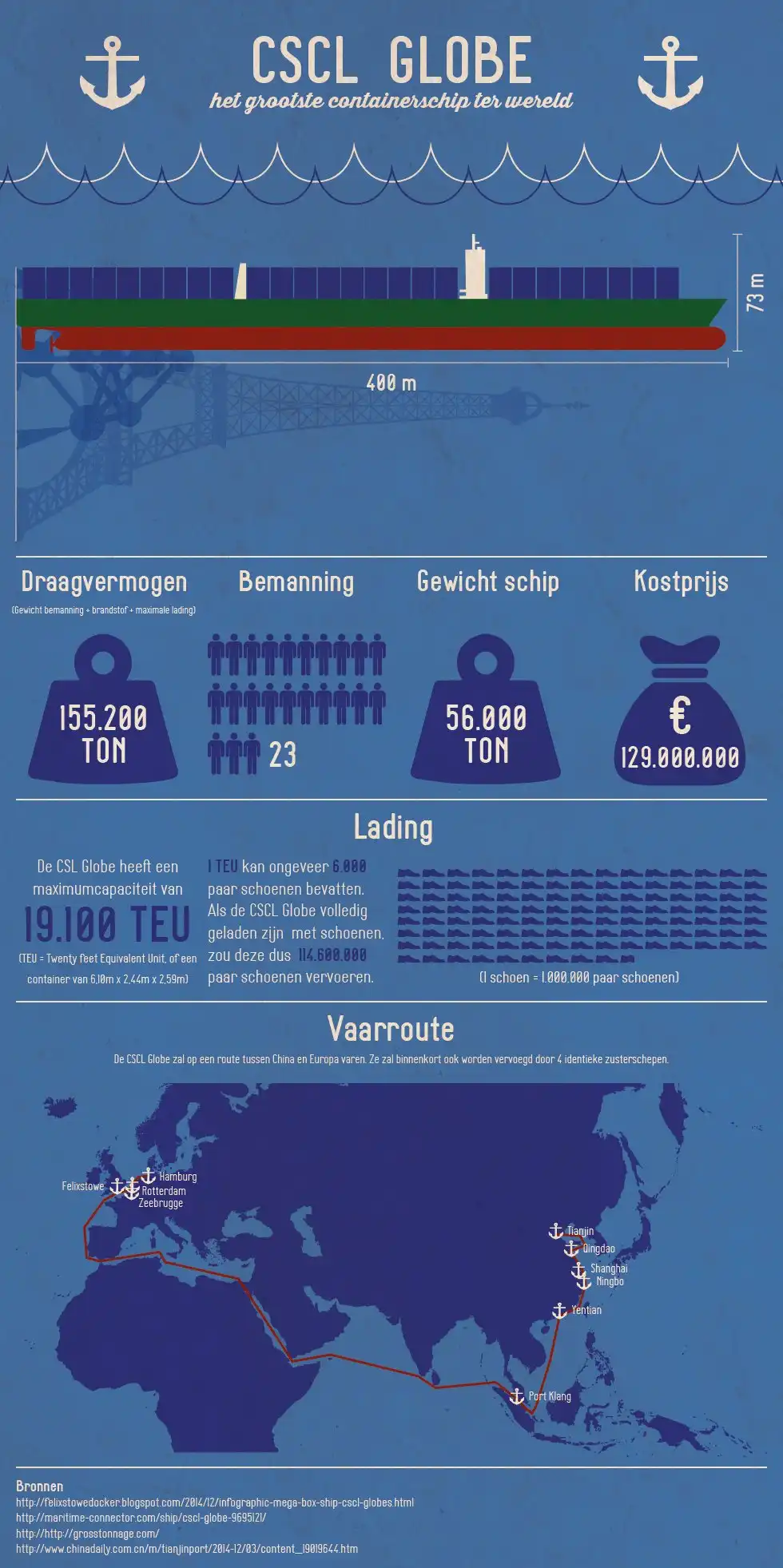 В январе 2015 года самый длинный в мире контейнеровоз CSCL Globe совершил свой первый рейс из Китая в Европу. Он был построен на южнокорейской верфи Hyundai Heavy Industries и принадлежит китайской компании China Shipping Container Lines. Хотя это судно — самое крупное среди контейнеровозов (на нем могли бы проходить забеги на дистанцию 400 м), оно уступает по грузоподъемности другому гиганту: MSC Oscar, которое также недавно было построено в Южной Корее для итальянской компании и может перевести на 124 контейнера больше. Разница невелика, зато у китайского контейнеровоза и длина больше, и двигатель самый мощный в мире: в моторном отсеке судна прячется дизельный двигатель MAN мощностью 77 200 л. с. и высотой 17,2 м. Корейские судостроители не собираются останавливаться на достигнутом и прогнозируют появление новых гигантских контейнеровозов.