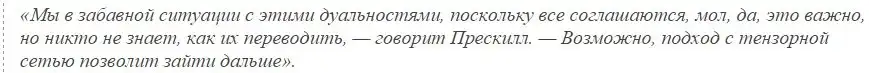 Физики продолжают бороться с этой запутанной проблемой, связанной с фундаментальной картиной, но очень подозревают, что она связана с квантовой информацией. «Когда мы говорим о том, что информация кодируется, мы имеем в виду то, что можем разбить систему на части, и будет некоторая корреляция между этими частями, так что можно будет узнать что-то об одной части, наблюдая другую», — говорит Прескилл. Такова суть запутанности.
